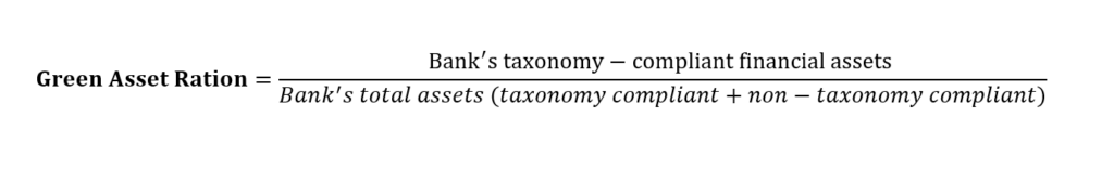 What is required? The Green Asset Ratio calculates the proportion of a bank’s financial assets, such as loans, investments in debt instruments (including green bonds), equity securities, acquired collateral, and other assets in taxonomy-compliant economic activities, relative to the total value of the bank’s assets. The calculation of the total value includes loans to sectors not yet covered by the taxonomy, loans to SMEs not yet required to report on sustainability3, interbank loans on demand and exposures outside the European Union. Generally, the formula can be illustrated as follows, resulting in a lower ratio for banks with a high share of assets not covered by the EU taxonomy: