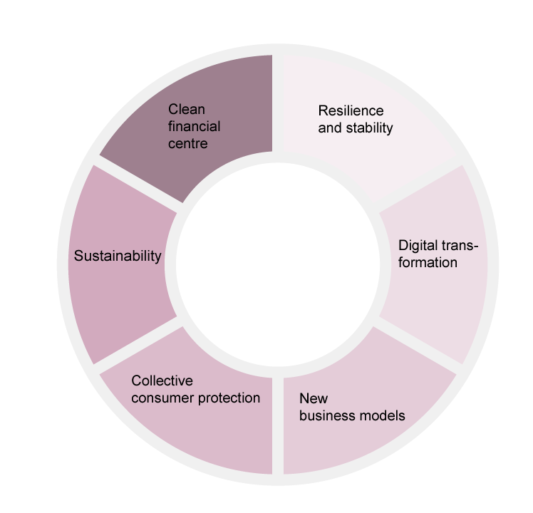 – Identify risks and proactively manage vulnerabilities: Monitoring geopolitical and economic developments and their impact, in particular inflation, interest rate risk, credit risk as well as liquidity risk; ongoing discourse with supervised entities; vulnerability testing and stress testing. An additional focus will be on monitoring developments in the property sector.